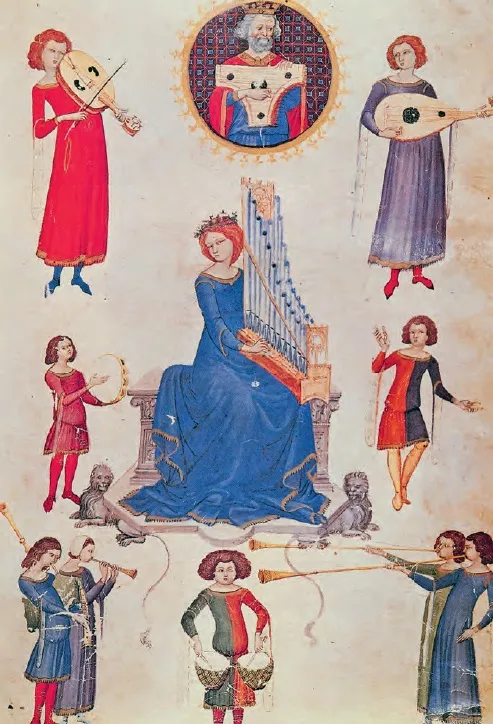 Музыканты. XIV век. Миниатюра из сочинения Боэция «Наставление к музыке» (De institutione musicae). Ms. V. A. 14, f. 47 r. Неаполь, Национальная библиотека. Вверху слева направо: виела, царь Давид с псалтерием, лютня; в центре: портатив (переносной орган), по сторонам — бубен и кастаньеты; внизу, в центре: литавры, по сторонам — прямые трубы.