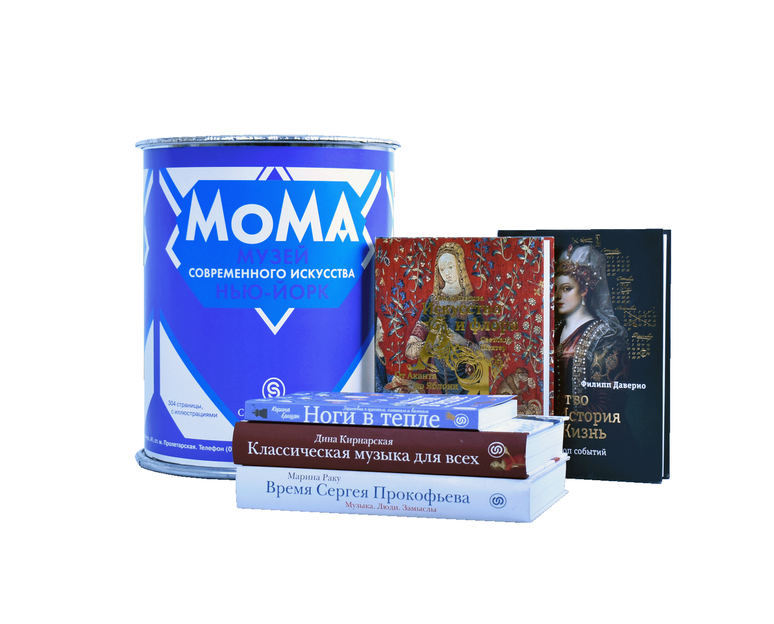 - Банка из проекта «Бук-поп-арт» — знаменитая банка, служившая коробом для альбома «МОМА. Музей современного искусства. Нью-Йорк», которая в комплекте с одноименным альбомом хранится не только у наших читателей, купивших ее много лет назад, но и в самом музее МОМА в Нью-Йорке, а также в Государственном Эрмитаже в Санкт-Петербурге. У проекта «Бук-поп-арт» богатая история, а сами банки, которые были изготовлены специально для него по заказу издательства в 2006 году, экспонировались на выставке Арт-Москва и украшали собой книжную витрину-инсталляцию в магазине «Москва» на Тверской. С тех пор прошло много лет, тираж альбома закончился, а за небольшим количеством оставшихся банок началась охота среди коллекционеров. В преддверии Нового Года мы решили сделать сюрприз нашим читателям и ненадолго возродили проект «Бук-Поп-Арт», заново наполнив его другими книгами нашего издательства!